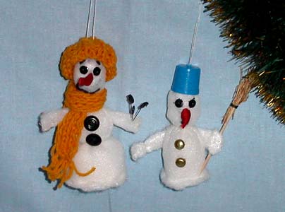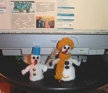 пришиваем руки и одеваем во что придется или по вкусу одариваемого. В нашей семье, например, привычны кисточки для живописи. Другому снеговику я дала в руки страдиционный предмет - метлу. В верхней части головы нужно закрепить нитку.