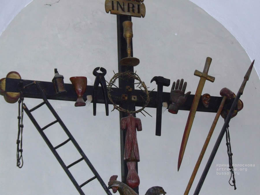 В верхней части города возвышается церковь, как написано на фасаде, 1865 года постройки. В ней я нашла крест с набором предметов, которые до сих пор на крестах не встречала - столярные инструменты, фонарик, одежда из дерева, кубок, отрубленная кисть руки и ухо, терновый венец, холодное оружие - пика и меч - и еще что-то.
