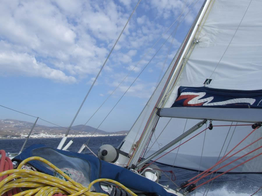 В 15 часов Дима запустил двигатель на всякий случай и какое-то время шли под мотором и под парусами. В 15-10 вдруг задул шквалистый ветер, начав с 20 узлов, он усиливался, как будто поджидал нас на подходе к Тиносу. Яхта пошла с диким креном на правом борту под полными парусами. Это случилось так неожиданно, что в первые 10-15 минут мы даже забыли отключить двигатель.