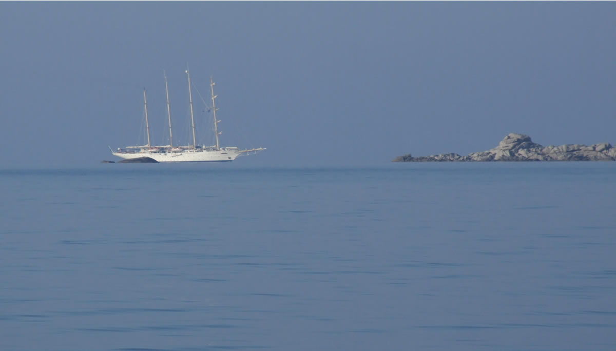 В 8-40 на гоизонате показалось волшебное видение - белоснежный четырехмачтовый парусник. Он шел под двумя парусами, пересекая наш курс слева направо. Потом паруса как в мультике плавно убрались, парусник стал входить в пролив между Делосом и соседним с ним островом. Волшебный корабль скрылся за южной оконечностью священного острова.