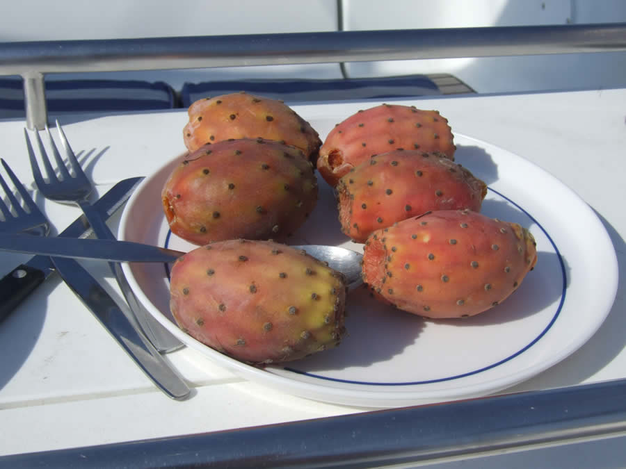 Дима стал чистить плоды опунции. Занятие ответственное. У них очень сочная и приятная на вкус мякоть, но агрессивная опушенная поверхность. Ни одна щетинка не должна попасть в рот, иначе будет трудно ее удалить. Щипание уголков рта от переедания ананаса полная ерунда по сравнению с последствиями беспечного обращения с опунцией. Ровно 11 лет назад Дима впервые купил для меня эти экзотические плоды в Ницце. Предупредил, но я недооценила последствия :) Помучились.