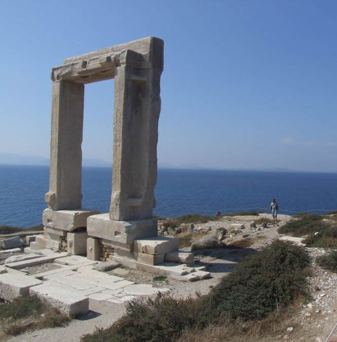 Рядом с портом на маленьком острове Палатия стоят огромные ворота из мрамора. Это - Портара, она же Палатия - то ли недостроенный, то ли разобранный для строительства крепости храм Аполлона. К острову проложена дамба. На фотографии внизу можно сравнить Диму и Портару.