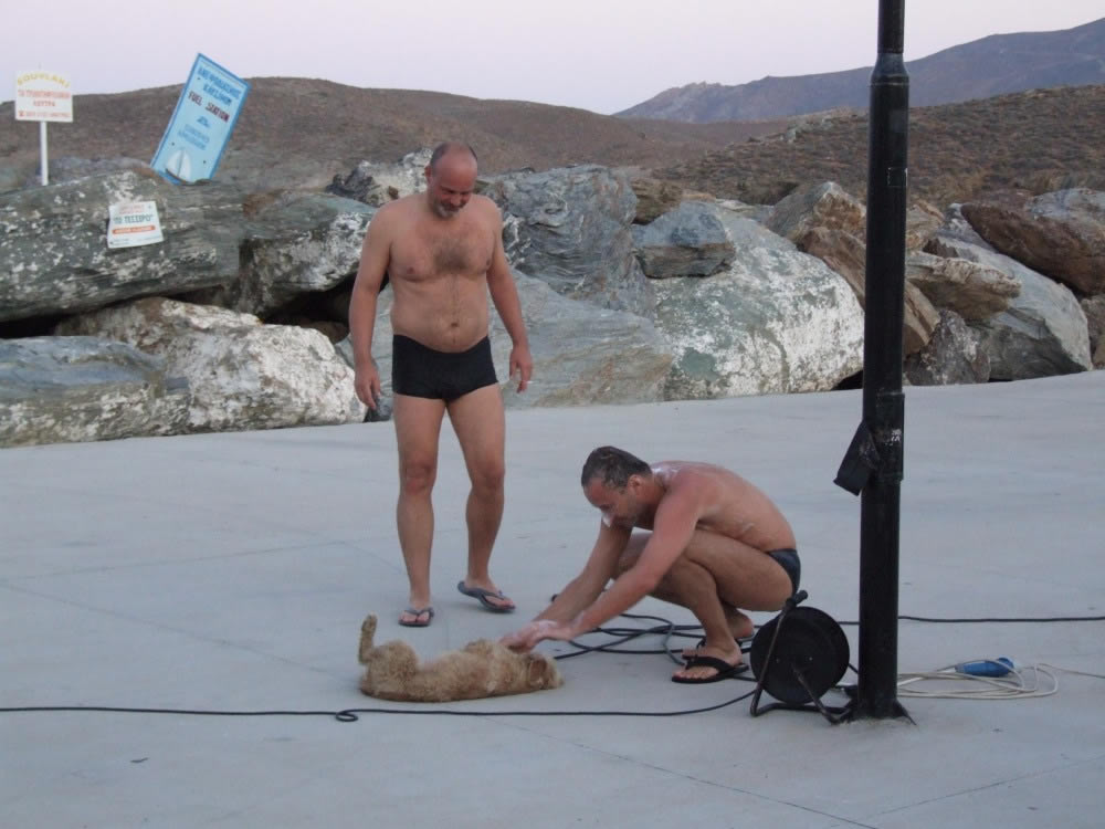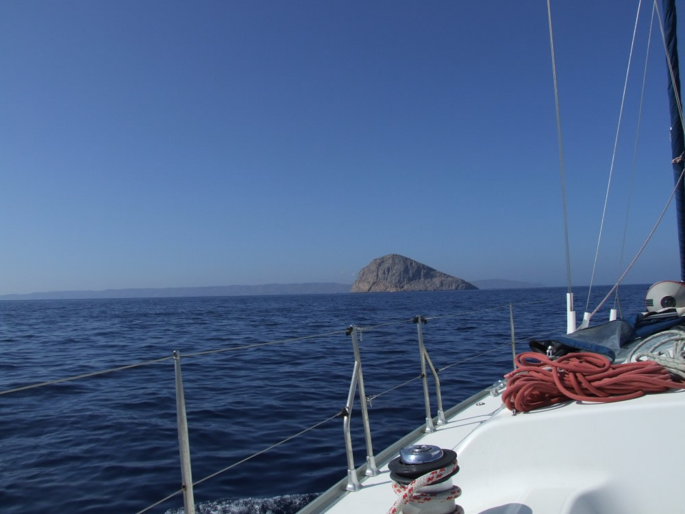 Ветер совсем стих, там, где мы вчера упирались против сильного ветра на моторе, идем в обратном направлении пости с той же скоростью со скоростью, поставив паруса "бабочкой". Отойдя от Серифоса пошли веселее. В этот день я не один раз искупалась на швартовом, потому что моим привычным для этих целей красным шкертиком вчера укрепили на палубе "тузик". Швартов был значительно толще, Димка шутя заправил его в левую лебедку. Оказалось, не зря - ветер чуть окреп и меня сильно потянуло. Подтягивая меня лебедкой, Димка посчитал - я тормозила яхту на 2-3 узла.