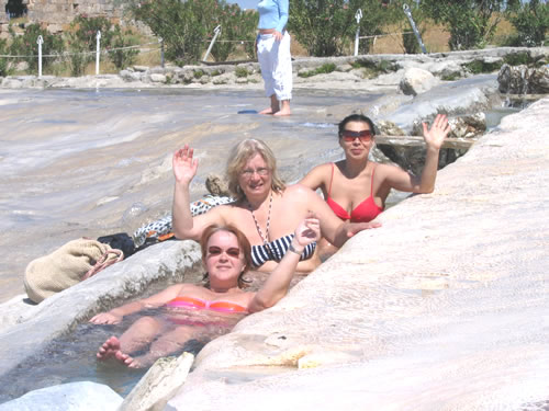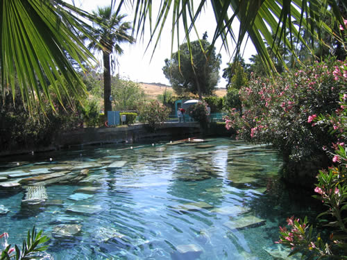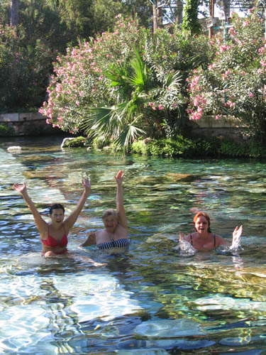 На вершине горы находится природный бассейн с тёплой (+320C) газированной минеральной водой, в котором за небольшую плату 18 лир или 13,5 дол. можно плавать туристам. Сравните со стоимостью 2-х часов в хлорированном московском бассейне. По дну водоёма разбросаны живописные античные колонны, есть глубокие места, есть водопадики, которые можно использовать как своеобразные джакузи для водяного массажа. По берегам растут папоротники с мелкими листочками, которые у нас называют "волосы вероники", над ними - цветущие олеандры, следующим ярусом - вееры листьев пальм. В просвет между растительностью можно видеть развалины античного театра Гиерополиса. Приятные ощущения и от воды - она напоминает нашу газировку. Мелкие пузырьки покрывают тело, а над поверхностью взлетают крошечные фонтанчики. 2 часа купания пролетели незаметно.