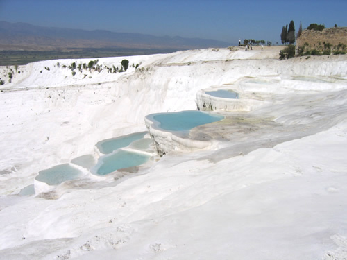 "Памуккале" означает "хлопковая крепость". Природные источники горячей минеральной воды, состоящей из соединений кальция за столетия покрыли гору солями кальция, создав причудлиые соляные террасы с озерками воды - травестины. Уникальное природное явление - белоснежная гора - внесена ЮНЕСКО с список всемирного наследия.