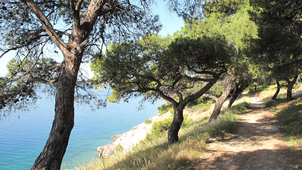 Городок из глубины бухты перекидывается на длинный узкий полуостров Кастри (KASTRI), на котором растет реликтовый сосновый лес. Вокруг леса, вдоль побережья идет пешеходная дорожка и стоят скамейки, сидя на которых так приятно любоваться ослепительно синим ласковым морем.