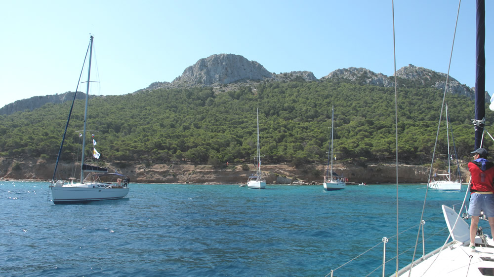 Итак, штиль. Тем сложнее задача – использовать любой порывчик, мегкое дуновение, чтобы выбраться из безветренной «лужи» на узкую полоску трепещущей под легким ветерком воды. При таких условиях проявляется мастерство шкиперов. Мы зафиксировали промежуточный результат по прохождению яхтами мыса ближайшего острова и быстро ушли вперед под мотором в красивую бухточку с лазурной водой у о. Ангистри. Мне дали полчала на плавание. Помимо плодов урбанизации видела на дне несметное количество «морских огурцов» и черных ёжиков. Но полчаса не получилось - уже через 20 минут мы мчались к финишной линии - показалась первая яхта флотилии - малышка SALONA 37. Она шла под заявленным спинакером и потому заметно обошла всех участников. Вскоре пришел «Евангелос». Остальные мачты застыли вдали. Главный судья объявила о досрочном завершении этапа. Яхты пошли к Поросу под мотором. Не путать с о.Парос на Кикладских островах!