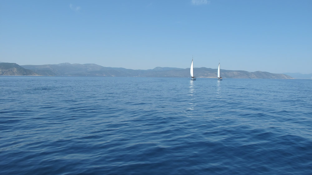 На второй день регаты, едва дали старт, ветер почти стих. С борта судейской яхты мы смотрели на белые треугольники парусов, неподвижно застывшие на фоне Пелопоннеса. Зависли все, а стартовали только 10 яхт из 12. Саша Чомский на POLO III лавировался со своим детско-девичьим экипажем и не успел подойти к стартовой линии, а яхта Олега Чеснокова PHOEBUS задержалась у пирса не смогла быстро освободиться от перекрывших ее якорь чужих якорных цепей . У нас было то же самое, но капитан Игорь Бордун как волшебник изящно, буквально за секунды, скинул чужую цепь. Я видела только одно - Игорь подтянул свою цепь и подвязал к ней конец. Я так и вышла в море с открытым от восхищения ртом. Кто распутывал свой якорь, как я в прежние годы, тот поймет и оценит.