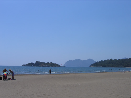 Находится в месте впадения реки Дальян в Средиземное море. В его песке, как говорят доверчивым туристам, откладывают яйца гигантские морские черепахи с запоминающимся названием Caretta Caretta. Мы их не встретили. И правильно делают, что не выходят - для туристов на пляже в огромных количествах поставили зонтики и лежаки, понастроили всякие едальни, цивильные туалеты и возят туда толпами.