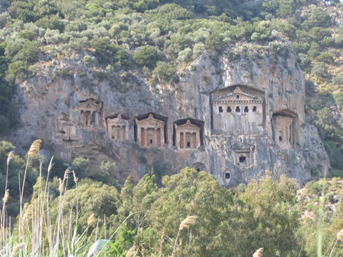 Из озера Кёйджегыз берет начало река Дальян. Она плавно течет по равнине - по берегам заросли высоченных камышей, а в высоких скалах вырублены мавзолеи царей (см. ниже).